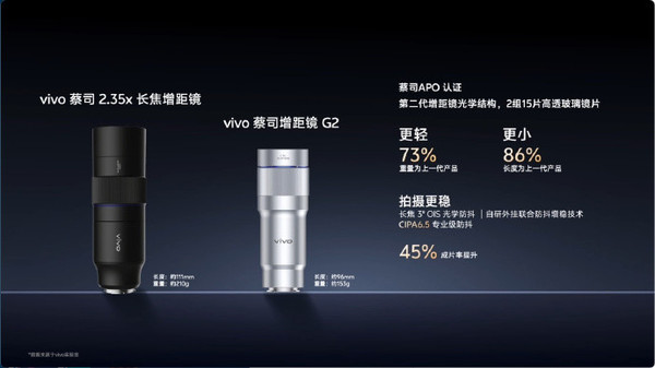 两款外置增距镜鉴识为vivo蔡司增距镜G2与G2 Ultra,可搭配X300 Ultra使用。G2为等效200mm长焦增距镜,选用第二代增距镜光学结构,由2组15片高透玻璃镜片构成,亚搏体育app中国最新版本分量较上一代粗犷73%,长度裁减86%,分量约153g,长度约96mm,赈济CIPA 6.5专科级防抖,官方称成片率教育45%。
