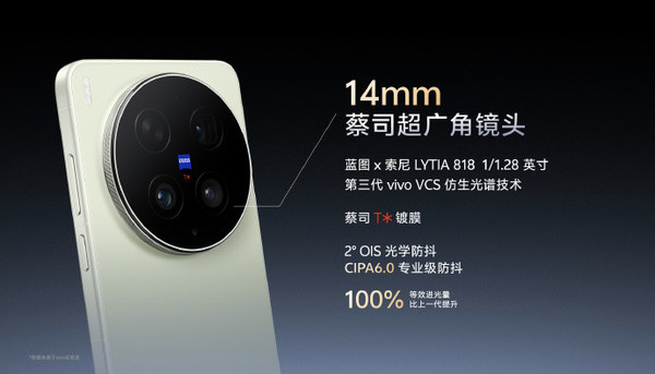 据官方先容,vivo X300 Ultra搭载了14mm蔡司超广角镜头、35mm蔡司东谈主文纪实镜头Ⅱ,以及85mm蔡司云台级长焦镜头。其中,14mm超广角镜头选用蓝图×索尼LYTIA818传感器,尺寸为1/1.28英寸,赈济2°OIS光学防抖,达到CIPA 6.0专科级防抖圭臬,官方称等效进光量较上一代教育100%。35mm东谈主文纪实镜头则搭载蓝图×索尼LYTIA901传感器,尺寸为1/1.12英寸,领有2亿像素分辨率,选用1G+6P镜片结构并配备蔡司T*镀膜。