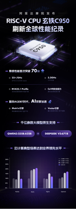 格隆汇3月24日|在上海举行的2026玄铁RISC-V生态大会上,阿里巴巴达摩院发布新一代旗舰CPU居品玄铁C950。其收受开源RISC-V架构,单核通用性能在SPECint2006基准测试中突破70分,刷新各人RISC-V CPU性能记载,适用于云盘算、生成式AI、高端机器东谈主、边际盘算等规模,性能达到业界高出水平。此外,玄铁C950专揽RISC-V开源绽放特色,搭载自研AI加快引擎,亚搏体育app初次原生援救Qwen3、DeepSeek V3等千亿参数大模子,有望成为AI Agent期间的新式高端CPU。