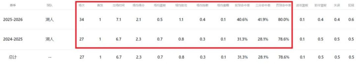 至于正赛数据,本赛季于今杨瀚森出战40场首发1次,场均上阵7.2分钟得到2.2分1.5板,三项射中率31.6%、12.5%和80%;二年龄的布朗尼出战34场首发1次,场均亮相7.1分钟拿下2.1分1.1助,三项射中率40.6%、41.9%和80%。