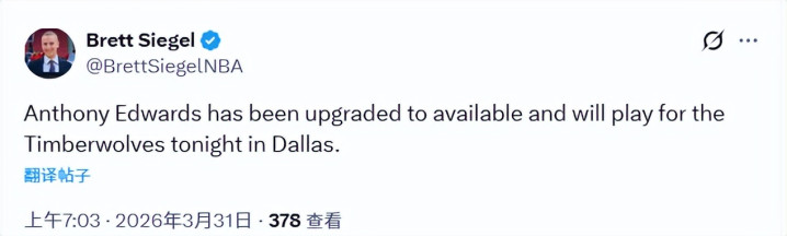 与此同期,丛林狼方面迎来一则好音信:球星安东尼-爱德华兹的景况被升级为不错出战,细则将在当天对阵独行侠的比赛中复出登场。爱德华兹因右膝伤势已聚积缺席当年6场比赛。若思获取入选NBA最好声势等赛季末奖项的参评阅历,爱德华兹需要出战当天的比赛,且惯例赛剩余场次不再缺席。