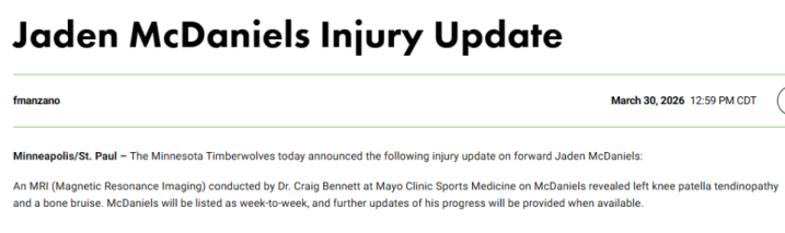 核磁共振检查效果流露,麦克丹尼尔斯患有左膝髌腱炎并伴有骨损害。他是在周四加时打败休斯顿火箭的比赛末段伤到膝盖的,并因此缺席了周日丛林狼不敌底特律活塞的比赛。
