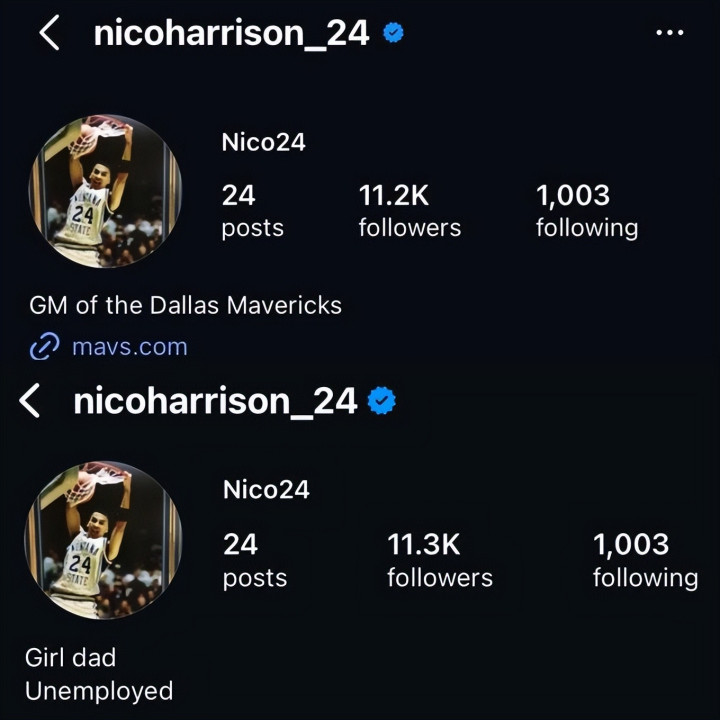 值得一提的是,哈里森前年11月被杜蒙罢黜后,他也转换了社媒先容,将“达拉斯独行侠总司理”改为“女孩的爸爸&空闲”。于今这两个标签还一直保捏着,这阐发哈里森还处于空闲的情状。