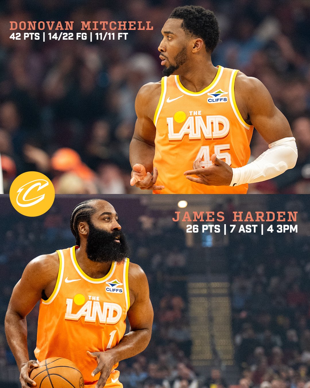 赛后,骑士社媒共享哈登与米切尔的个东谈主数据海报,并配文:“咱们的后场球员又一次火力全开。”
